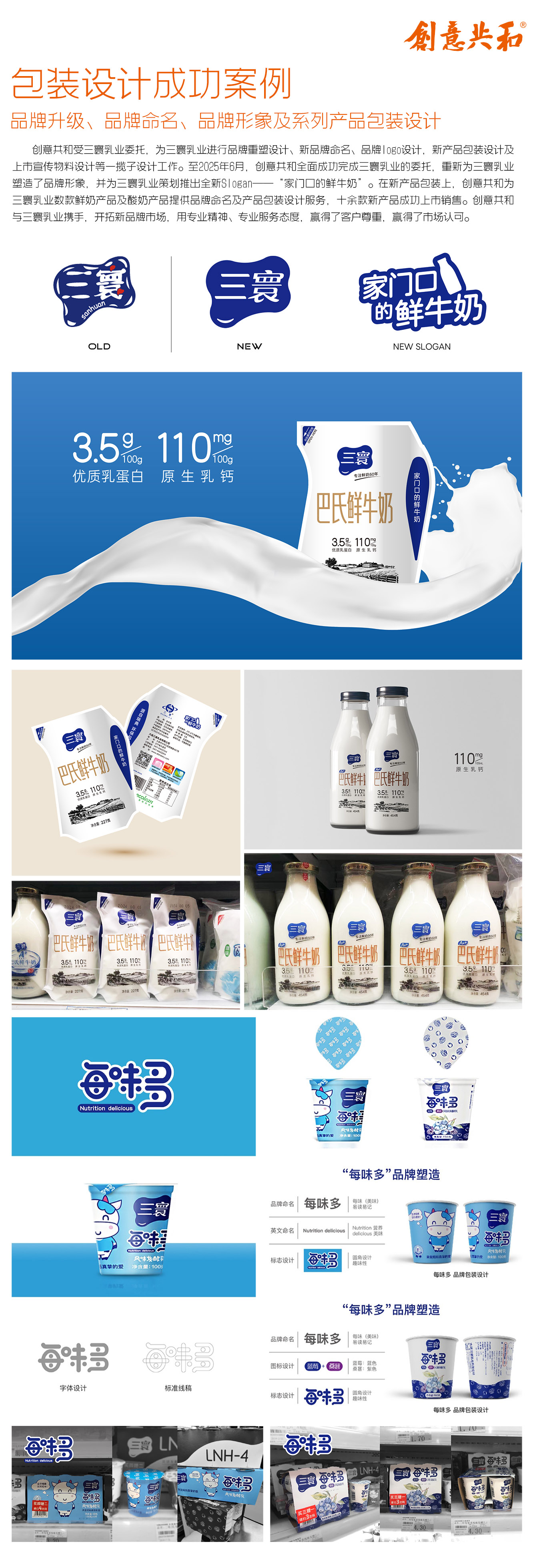 为三寰乳业提供品牌设计包装服务,策划出“家门口的鲜牛奶”品牌Slogan,并为升级后的三寰巴氏鲜牛奶爱克林装设计新包装,画面元素更简洁,品牌突出,颜色更品牌化;还为三寰乳业巴氏鲜牛奶、瓶装A++巴氏鲜牛奶及数款酸牛乳设计了全新包装,助力产品上市热卖。