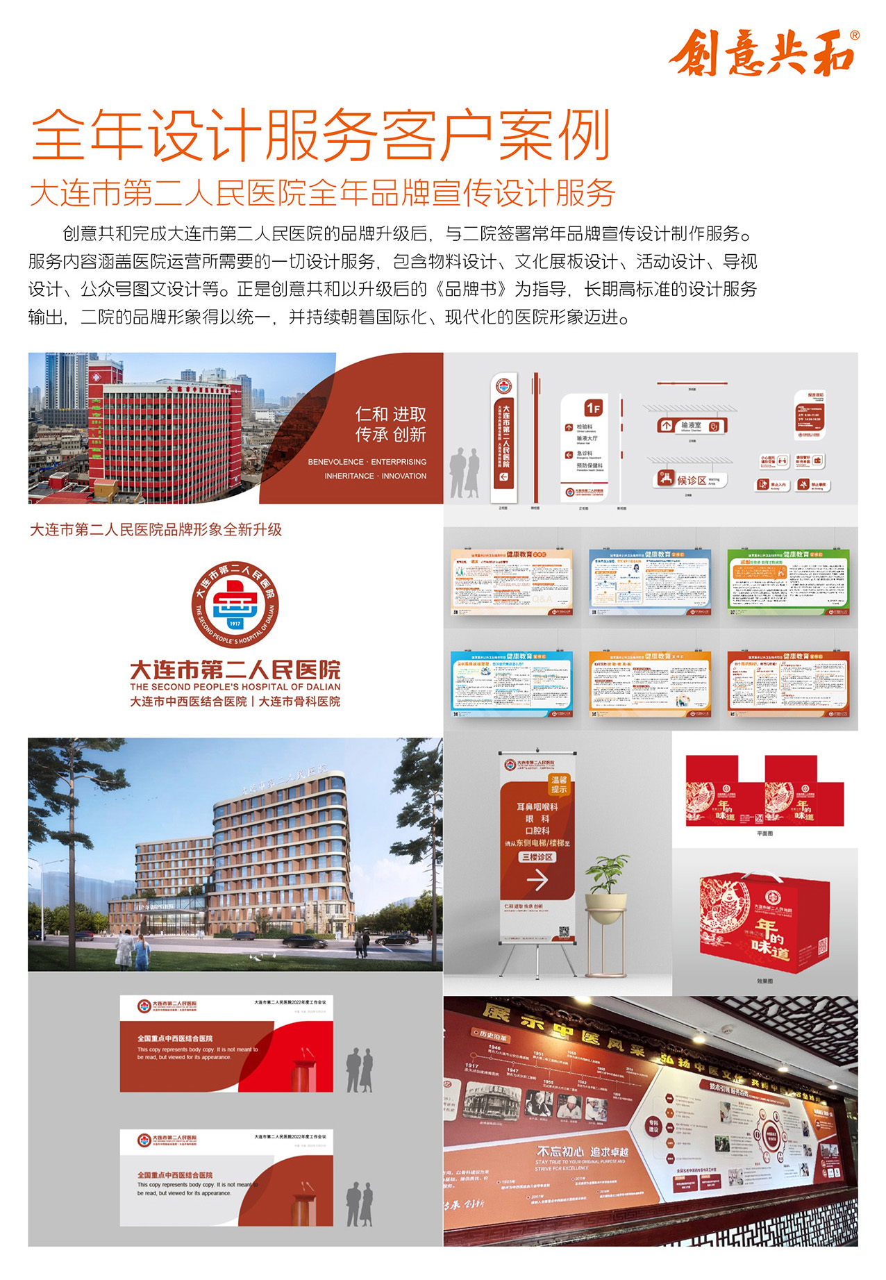创意共和为大连市第二人民医院提供全年设计服务。以医院骨科及中西医结合特色为核心,定制涵盖骨科专属标志、文化展板、活动视觉等全场景设计方案。通过统一的视觉语言,强化医院中西医结合的品牌定位,使其在日常运营、学术交流等场景中保持形象一致性,助力医院向国际化、现代化方向迈进。创意共和完成大连市第二人民医院的品牌升级后,与二院签署常年品牌宣传设计制作服务。服务内容涵盖医院运营所需要的一切设计服务,包含物料设计、文化展板设计、活动设计、导视设计、公众号图文设计等。正是创意共和以升级后的品牌书为指导,长期高标准的设计服务输出,二院的品牌形象得以统一,并持续朝着国际化、现代化的医院形象迈进。