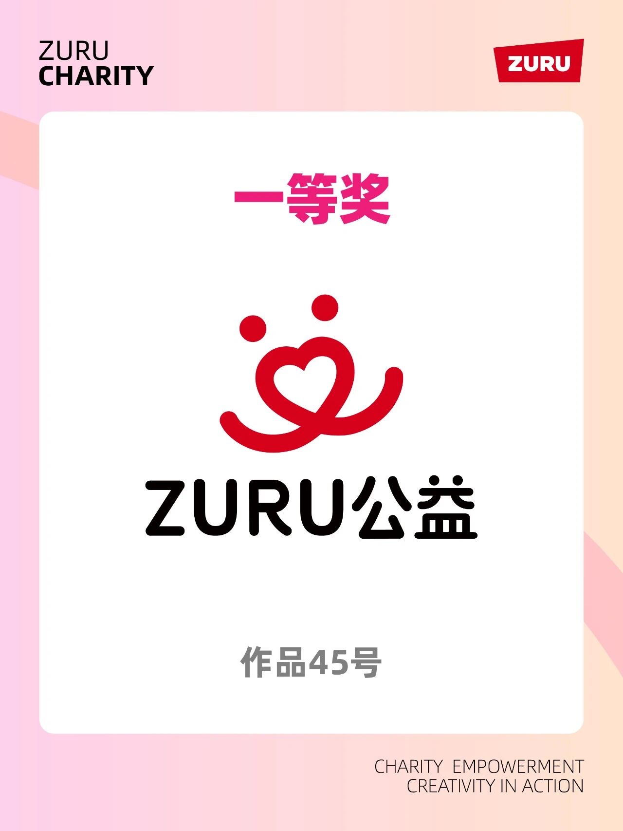 公示信息显示,本次大赛一等奖由作品45号获得,该作品以双人相拥与爱心结合的图形,传递温暖共创的公益内核,搭配ZURU公益文字标识,视觉识别性与情感共鸣感突出。