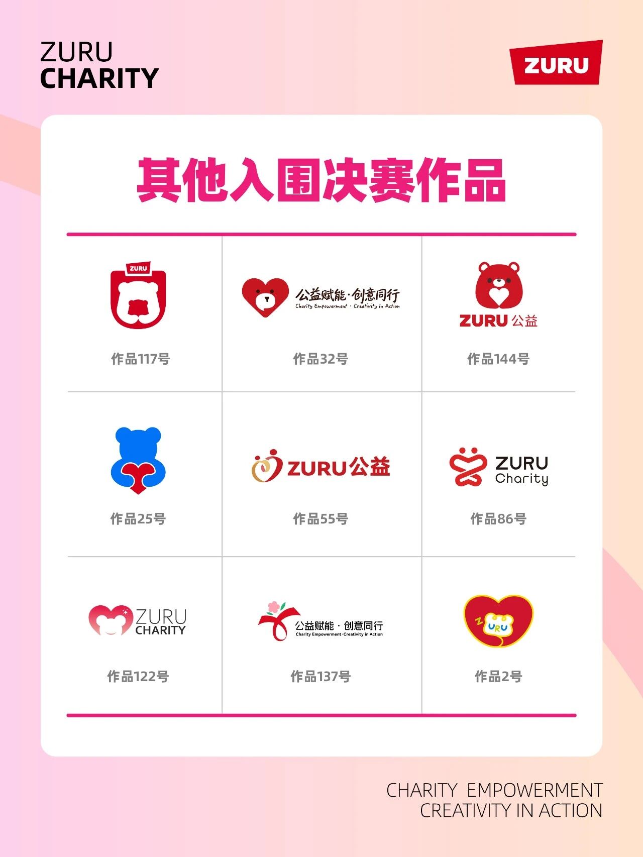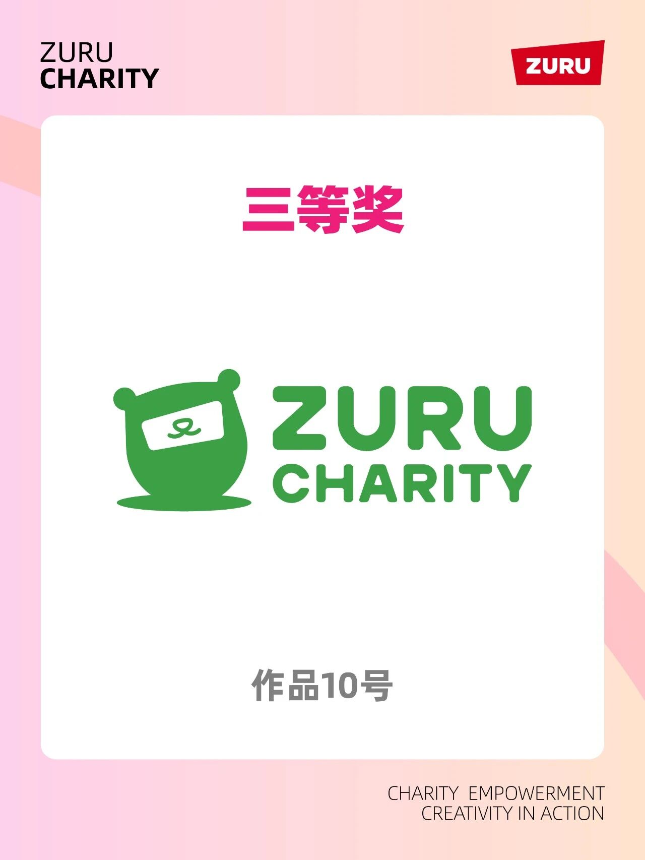 2026年3月10日,ZURUCharityZURU公益品牌Logo设计大赛结果正式对外公示,大赛历经初评网络投票及现场答辩等环节,从146份参赛作品中选出一等奖1名二等奖2名三等奖3名,共计15组作品入围决赛并获得证书及玩具大礼包。