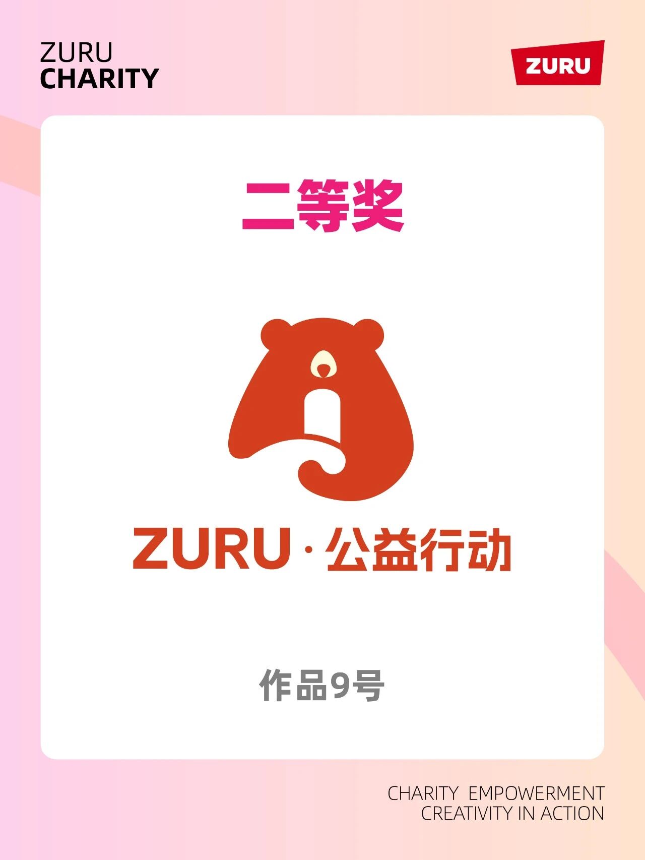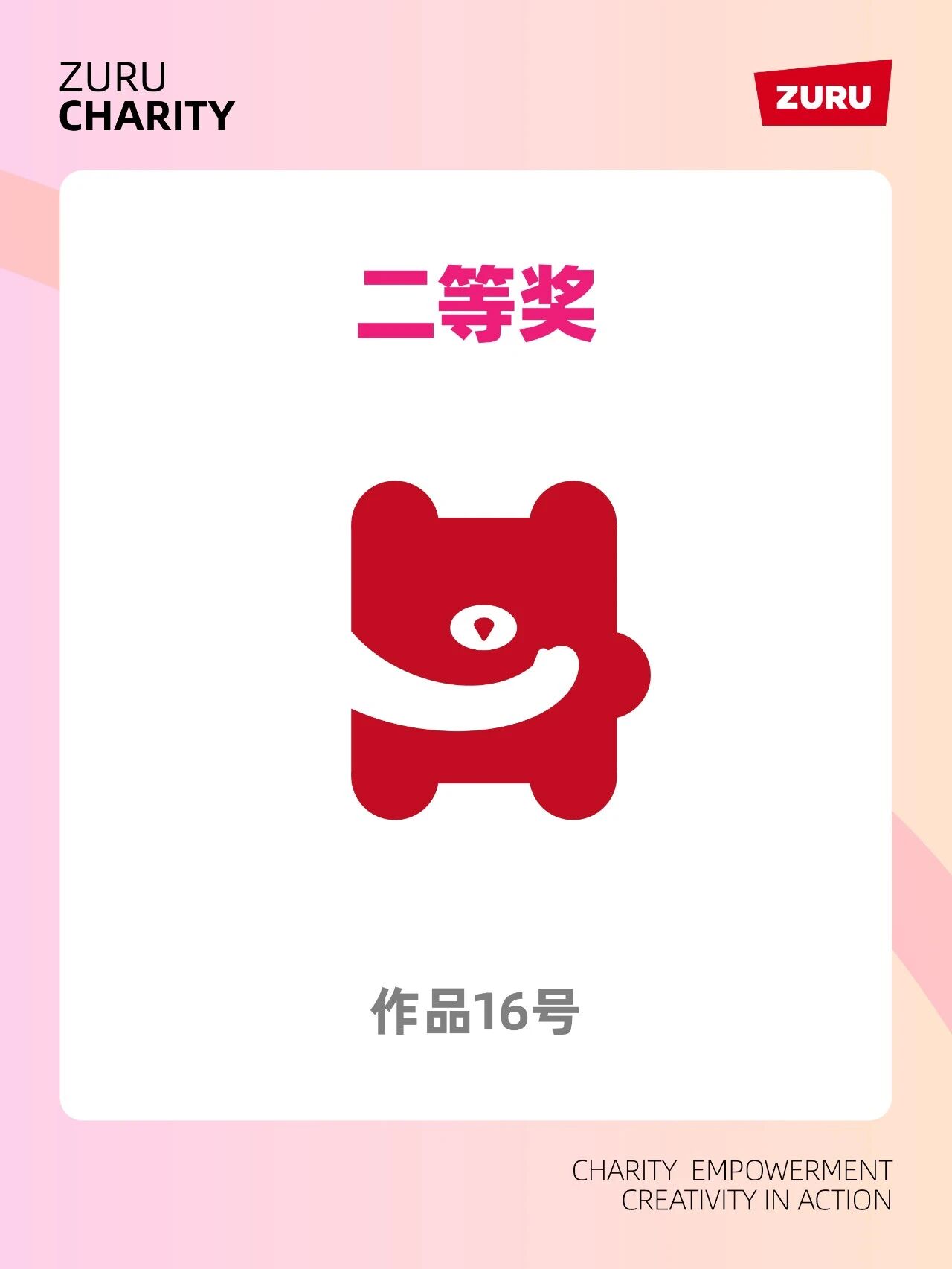 二等奖作品分别为16号与9号,前者以简约红色小熊形象传递童趣与善意,后者将熊头与公益符号结合,强化ZURU公益行动的品牌联想。三等奖作品为42号12号10号,涵盖丝带笑脸组合字母与图形融合以及绿色卡通熊形象等不同设计方向,展现了ZURU公益品牌视觉表达的多元可能性。