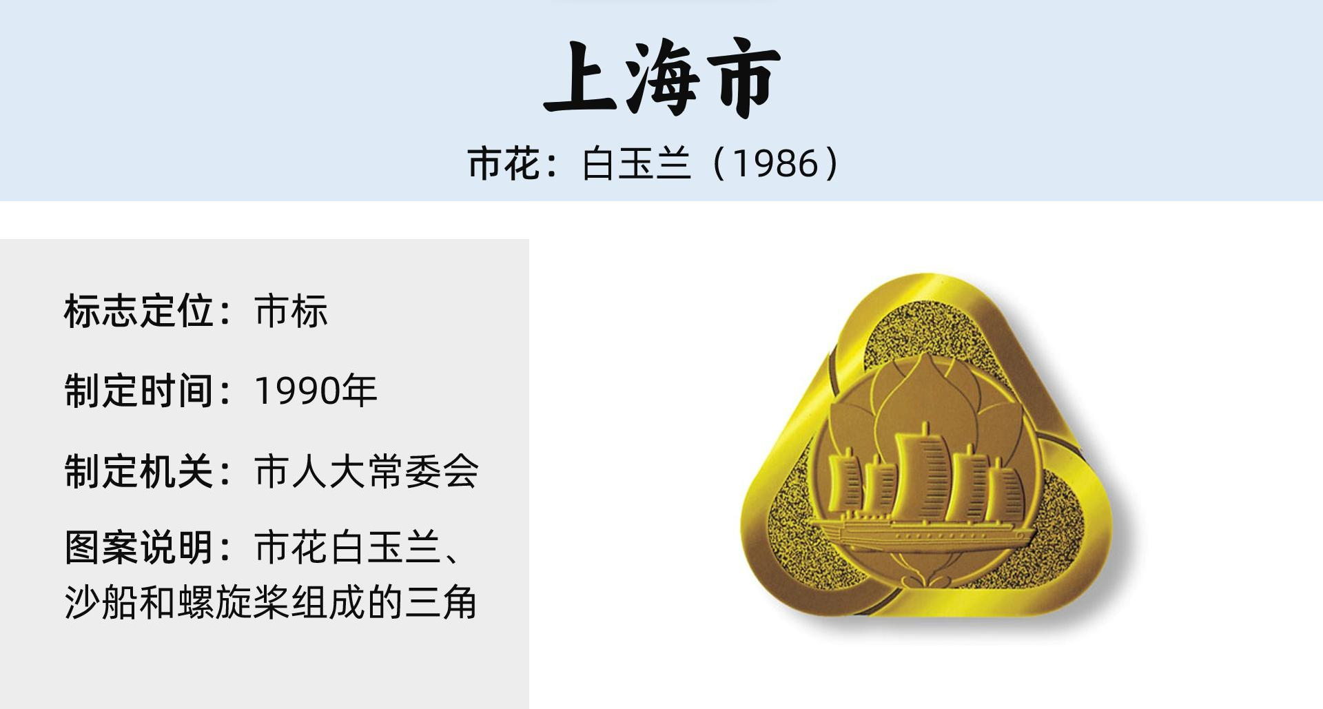 上海市市标采用三角形构图,整体由三个核心元素组成,分别是上海市市花白玉兰、沙船和螺旋桨。三个元素相互融合,结构简洁且寓意饱满,形成辨识度极高的城市视觉符号。