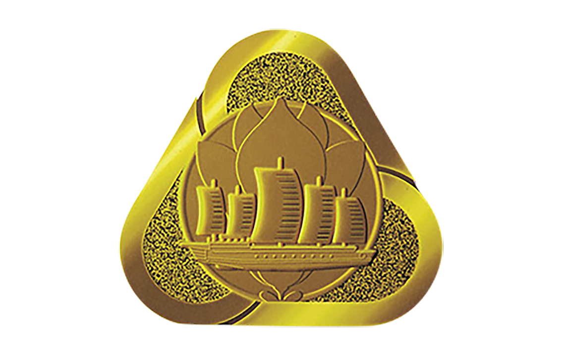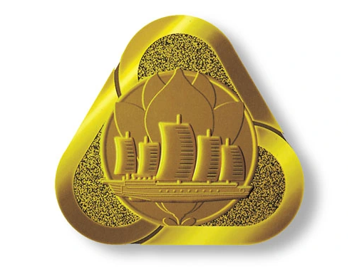 图案中心位置是扬帆出海的沙船,占据视觉核心。沙船后方是盛开的白玉兰,向上舒展的造型充满生机。外围的三角形结构则与螺旋桨意象统一,整体呈现出传统与现代结合、历史与未来衔接的设计气质。
