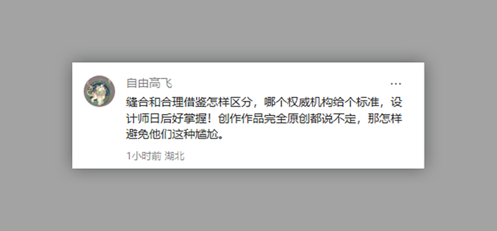 “结合和合理借鉴怎样区分?哪个权威机构能给个标准?设计师以后好把握。如果作品必须完全原创,那几乎不可能。”
