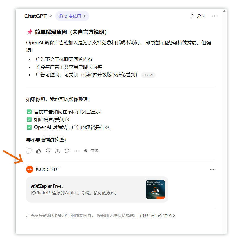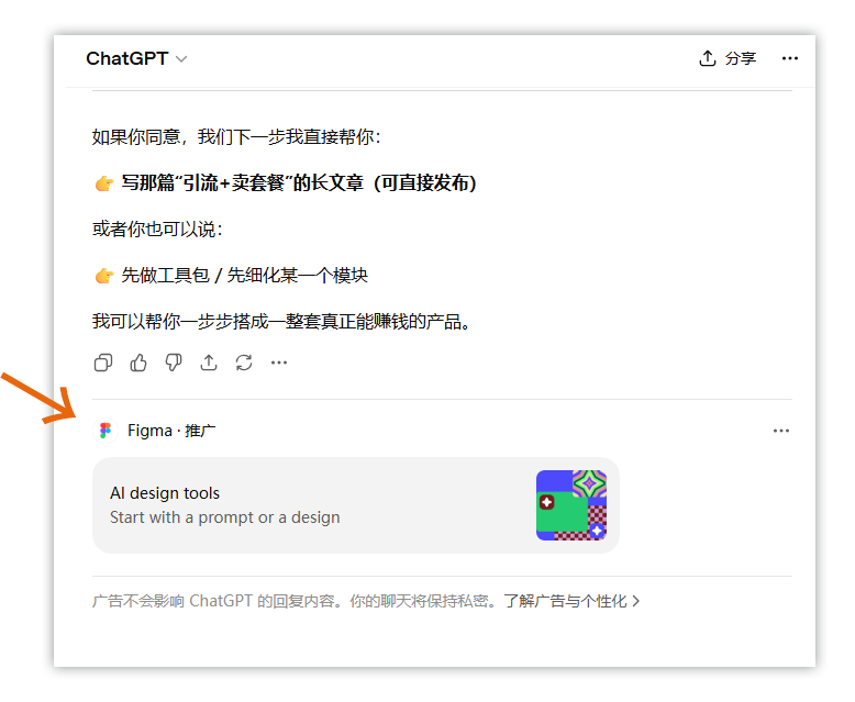 从标设网编辑实测的界面来看,ChatGPT的广告以独立消息卡片形式出现在对话末尾,不会打断正常问答流程。广告内容多为与用户对话场景相关的工具类或服务类品牌,例如在品牌设计相关对话中出现Figma推广,在自动化办公相关对话中出现Zapier推广。