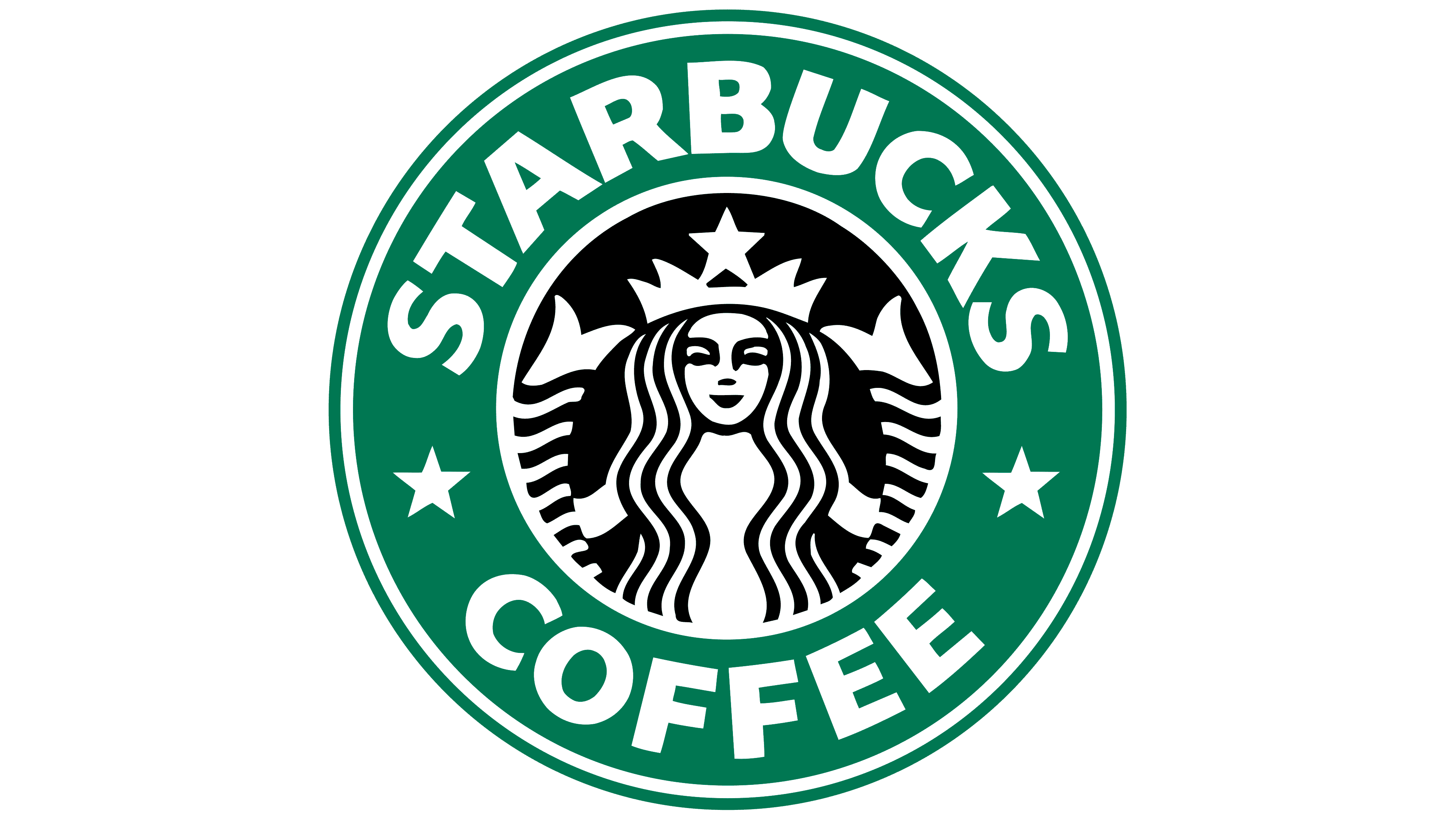 配色首次引入绿色体系,外圈文字保留Starbucks字样,下方仅保留coffee,并以星形分隔。