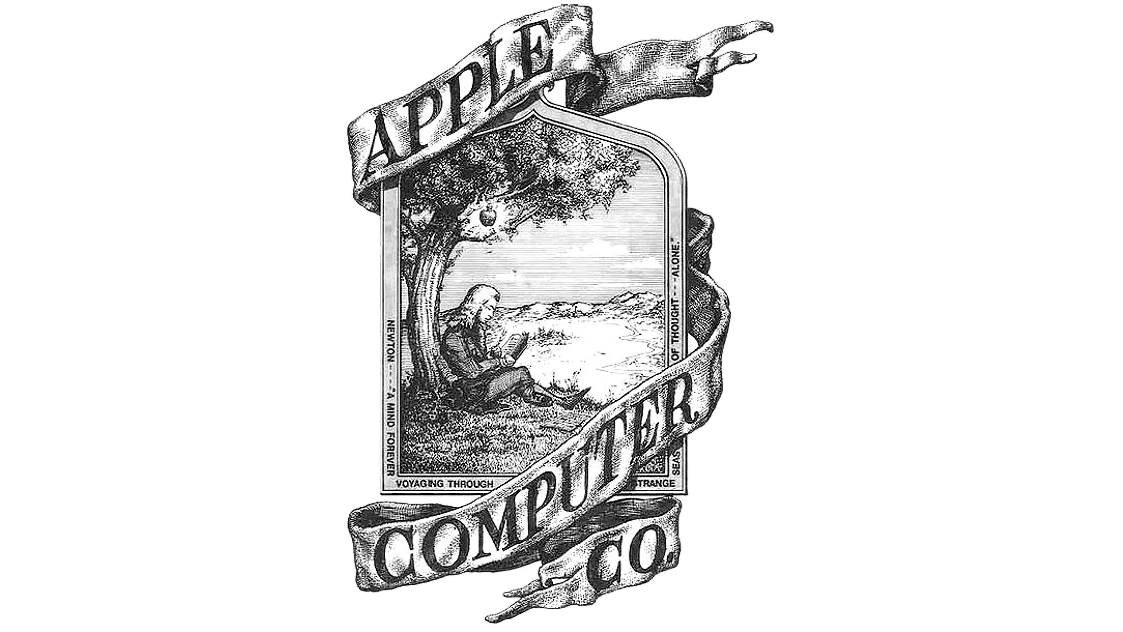 Apple苹果成立初期推出的首款LOGO,以长条矩形呈现复古版画风格,画面主体为坐在树下手持书籍的牛顿,枝头悬挂着一颗即将坠落的苹果,上下环绕的饰带标注企业全称,边缘还配有牛顿相关的哲理文字。