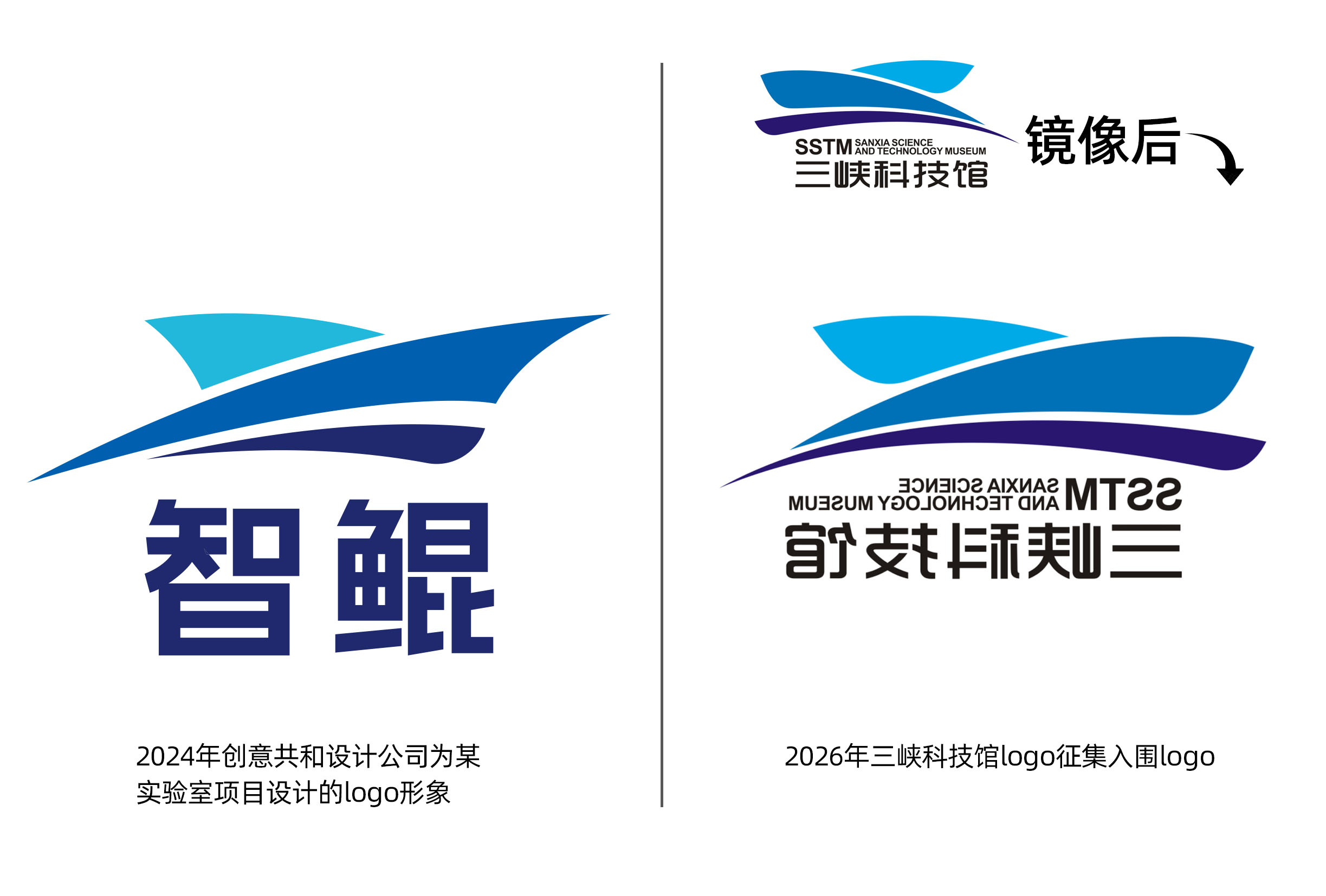 创意共和设计公司于2024年为某实验室项目设计的智鲲LOGO,与本次三峡科技馆入围的LOGO作品,在核心视觉元素上呈现出极高的相似度。两件作品均采用三层流线型飘带构成主体图形,分层结构、比例关系、线条走向完全一致,仅将原创作品做了水平镜像翻转,调整了飘带的收尾细节。