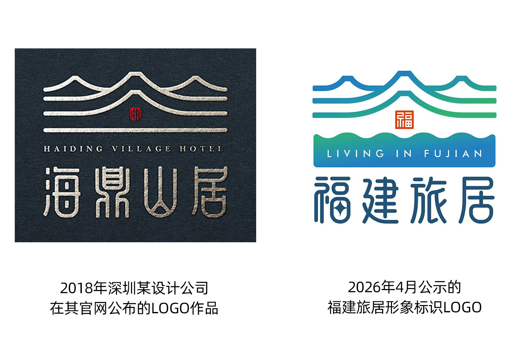 福建旅居口号与标识LOGO征集结果首次于2026年2月底对外公示,标设网随即指出其多件获奖作品属于典型的套路化投稿,存在大量同构图形在网络传播的情况,报道详见链接:福建旅居标识LOGO征集一、二等奖作品皆是套路货,专业评审形同虚设。相关问题被反馈后,福建方面对涉问题获奖作品进行了撤销处理,这一流程上的快速反应值得肯定。然而,4月初重新公布的最终采用方案,依然未能规避设计原创性风险,其图形结构与2018年某深圳设计公司发布的海鼎山居酒店LOGO高度接近,已不属于简单风格趋同,而是进入可识别的相似区间。