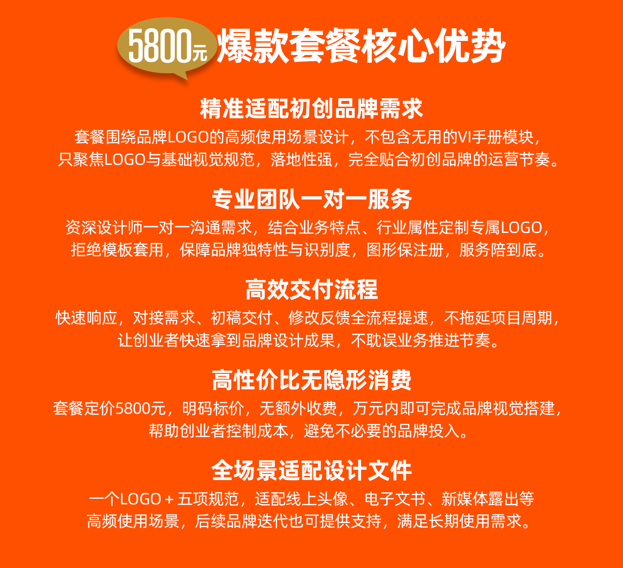 这款套餐以一个定制LOGO为核心,搭配五项高频场景规范,整体内容清晰实用,没有冗余项目,资金全部用在品牌起步的关键环节。