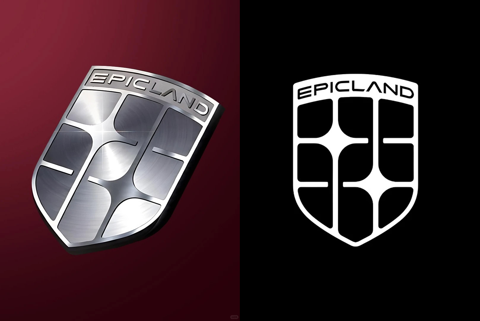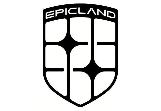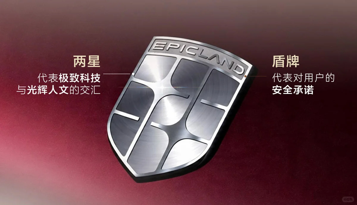 奕境车标采用盾形轮廓设计,顶部弧线环绕EPICLAND字样,下方线条划分出九宫格结构,交叉线条形成十字星造型。标设网注意到,盾形的设计语言与品牌主打的安全出行定位高度契合,为家庭用户的用车场景提供视觉层面的安全感传递。