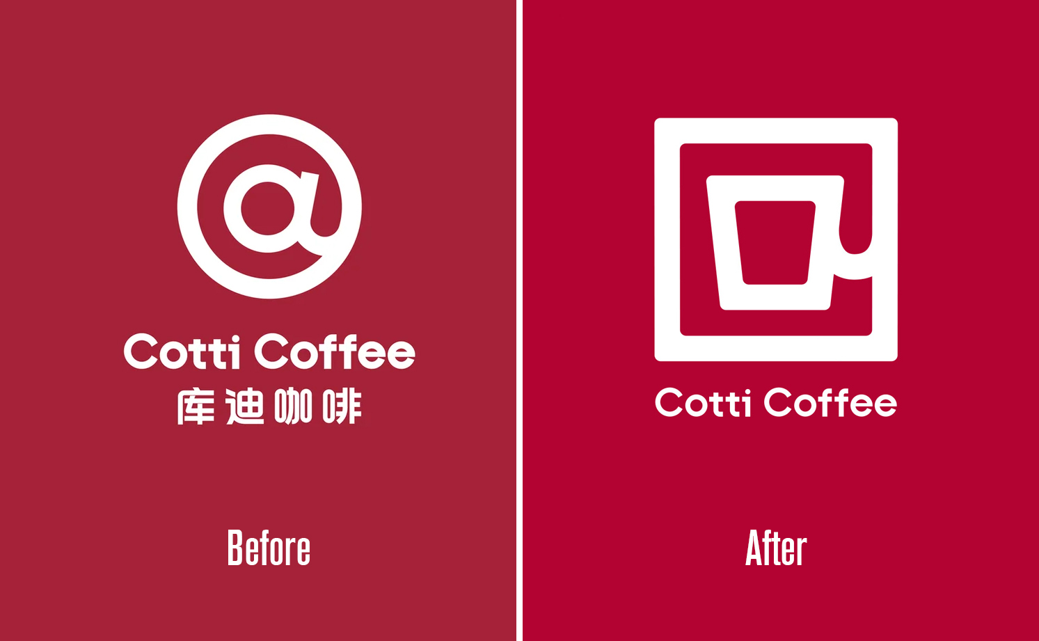 库迪咖啡全面启用全新方形咖啡杯LOGO设计,替换沿用已久的圆形@符号旧标识,缩小Cotti Coffee英文文字比例,放大图形主体,以此塑造专属品牌超级识别符号,整体品牌标识实现全面迭代升级。